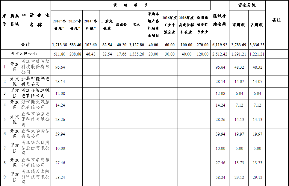 根據金華市人民政府《關于進一步降低企業成本減輕企業負擔的若干意見》(金政發〔2016〕25號)、《關于加快培育現代產業體系打造先進制造業基地的通知》(金政發〔2016〕40號)、《關于全面推進“三名”工程的實施意見》(金政發〔2014〕42號),金華市人民政府辦公室《關于培育發展市區工業大企業大集團的實施意見》(金政辦發〔2014〕7號)、《關于印發金華市區高成長企業培育辦法通知》(金政辦發〔2014〕6號)、《關于支持小微工業企業規范升級的若干意見》(金政辦發〔2013〕40號)、《關于促進小型微型企業再創新優勢的通知》(金政辦發〔2012〕79號)等文件精神,市經信部門及時下發通知,組織企業申報,經過企業申報、各區初審和金華君安會計事務所審計,現將2016年度市區小升規企業、工業大企業大集團、高成長企業、“三名”培育試點企業、采購本地產品項目、工業十強企業、高成長標桿企業、獲省級榮譽稱號企業等財政補助資金予以公示,公示期:2017年10月21日—10月27日,聯系人:鄭海員;聯系電話:82463730。