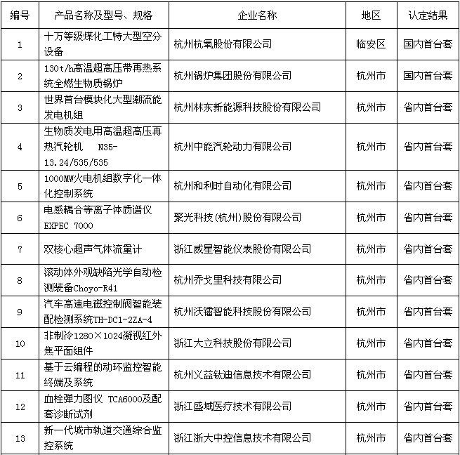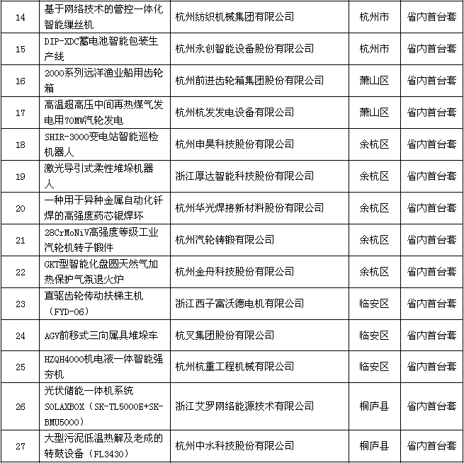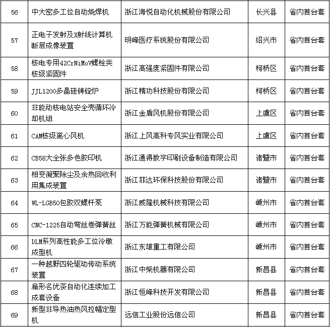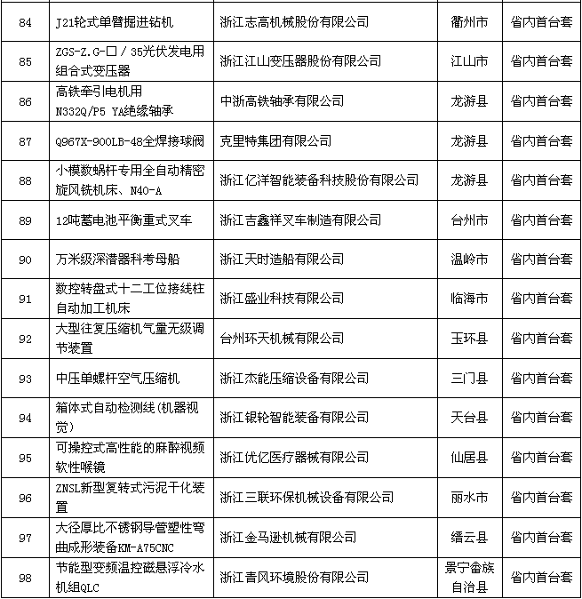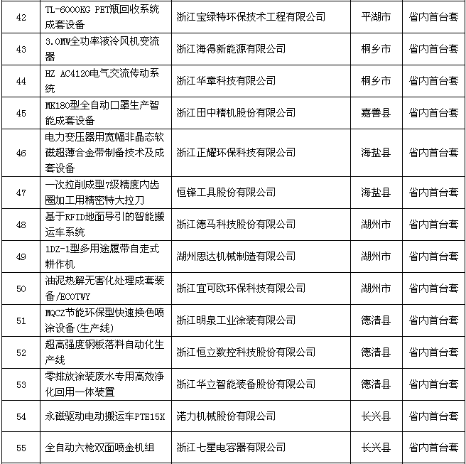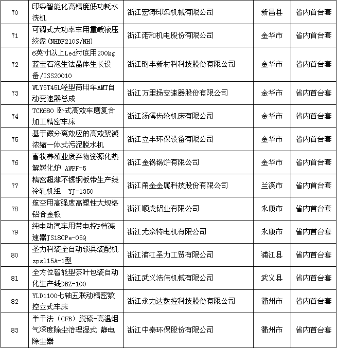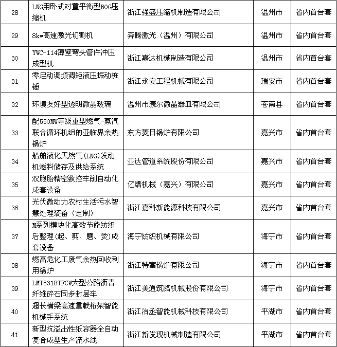 附件:2018年度浙江省裝備制造業重點領域首臺(套)產品認定結果公示名單
