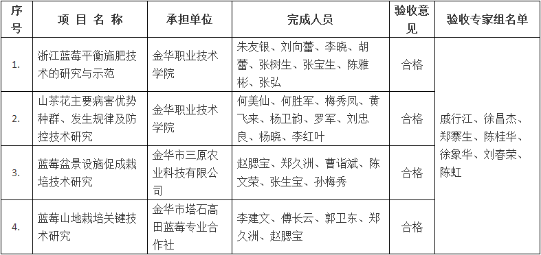 根據《金華市級科技計劃項目驗收管理辦法》(金市科字〔201583)規定,現將金華職業技術學院承擔的《浙江藍莓平衡施肥技術的研究與示范市級科技計劃項目驗收結果予以公示,接受社會監督,公示期從2018717日至2018724日止。任何單位和個人對驗收意見持有異議的,應當在公示期內書面向市科技局提出異議,單位應采用書面形式并加蓋公章,個人應采用實名提出異議。