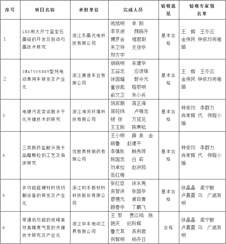 根據《金華市級科技計劃項目驗收管理辦法》(金市科字〔2015〕83號)規定,現將浙江東晶光電科技有限公司、浙江康迪車業有限公司、浙江海河環境科技有限公司、優勝美特制藥有限公司、浙江昀豐新材料科技股份有限公司、浙江華豐電動工具有限公司承擔的《LED用大尺寸藍寶石晶錠的開發及自動引晶技術研究》、《SMA7005BEV型純電動乘用車研發及產業化》、《電鍍污泥嘗試脫水干化關鍵技術的研究》、《三類新藥鹽酸頭孢卡品酯顆粒的工藝及臨床研究》、《多功能超硬材料線切割設備的研發及產業化》、《帶通訊功能的低噪高效高精度氣泵的關鍵技術研究及產業化》6個市級科技計劃項目驗收結果予以公示,接受社會監督,公示期從2018年7月20日至7月27日止。