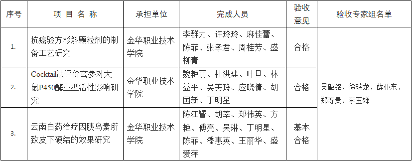 根據《金華市級科技計劃項目驗收管理辦法》(金市科字〔2015〕83號)規定,現將金華職業技術學院承擔的《抗癌驗方杉斛顆粒劑的制備工藝研究》市級科技計劃項目驗收結果予以公示,接受社會監督,公示期從2018年7月23日至2018年7月29日止。任何單位和個人對驗收意見持有異議的,應當在公示期內書面向市科技局提出異議,單位應采用書面形式并加蓋公章,個人應采用實名提出異議。