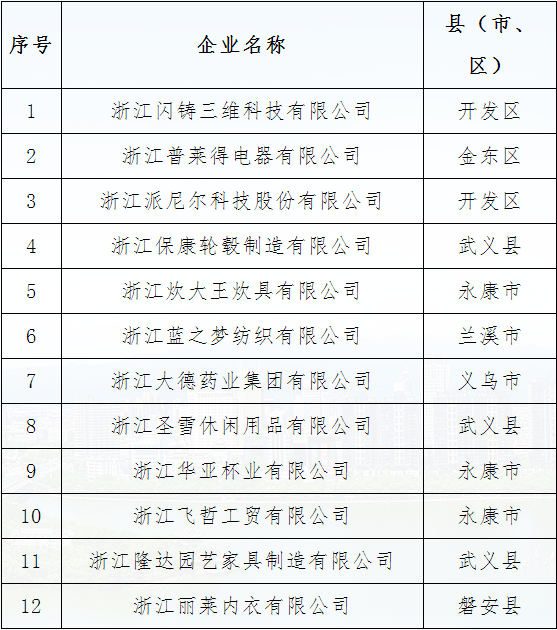 為加快推進金華市“三名”培育試點工作,根據《金華市人民政府關于全面推進“三名”工程的實施意見》(金政辦〔2014〕42號)、《關于開展金華市第四批“三名”培育試點工作的通知》(金三名辦〔2018〕2號)精神,經企業自愿申報,各縣市區初審并推薦上報,市“三名辦”委托第三方機構進行專家評審,報送金華市“三名”工程建設聯席會議討論通過,擬確定12家企業為金華市第四批“三名”培育試點企業。