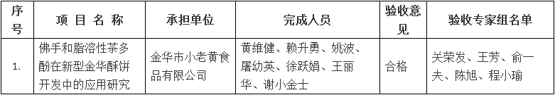 根據《金華市級科技計劃項目驗收管理辦法》(金市科字〔201583)規定,現將金華市小老黃食品有限公司承擔的《佛手和脂溶性茶多酚在新型金華酥餅開發中的應用研究市級科技計劃項目驗收結果予以公示,接受社會監督,公示期從2018821日至2018828日止。任何單位和個人對驗收意見持有異議的,應當在公示期內書面向市科技局提出異議,單位應采用書面形式并加蓋公章,個人應采用實名提出異議。