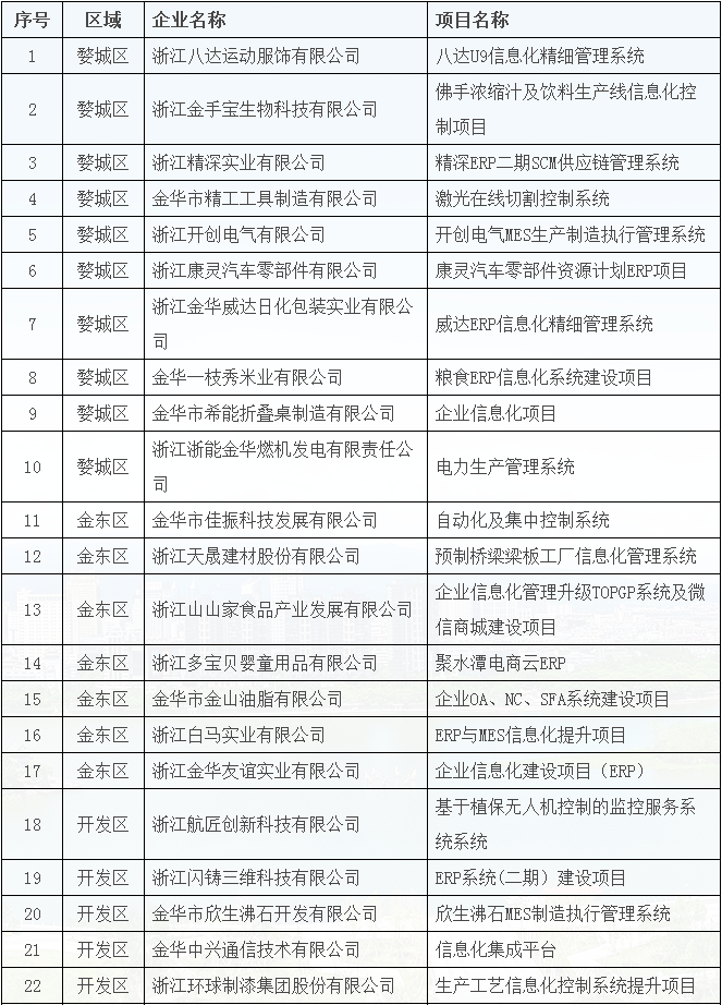 根據《關于組織申報2018年金華市兩化融合重點項目的通知》(金經信信息〔2018〕76號)文件要求,我委開展了2018年全市兩化融合重點項目立項評審,通過各縣(市、區)推薦申報、項目初審、組織專家復審,擬確定浙江八達運動服飾有限公司的八達U9信息化精細管理系統等144個項目為2018年金華市兩化融合重點項目?,F將名單予以公示,公示期為2018年9月30日-10月8日。如有異議,請于公示期間與市經信委信息化處聯系。聯系人:葉悠霞,電話:82469496,郵箱:jhxxhc@163.com 。