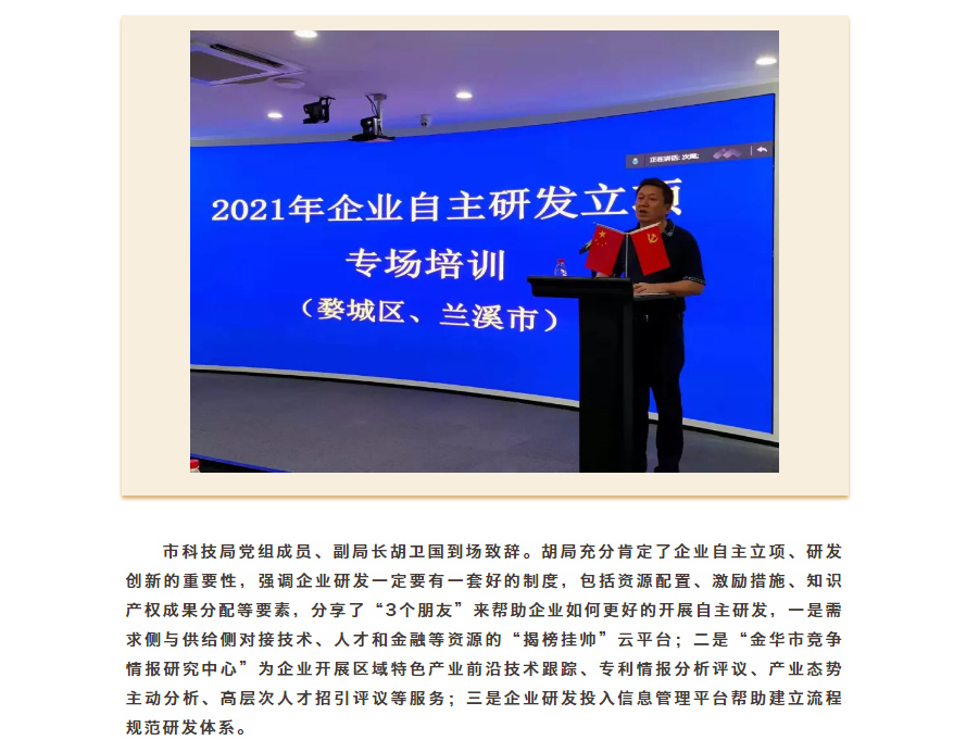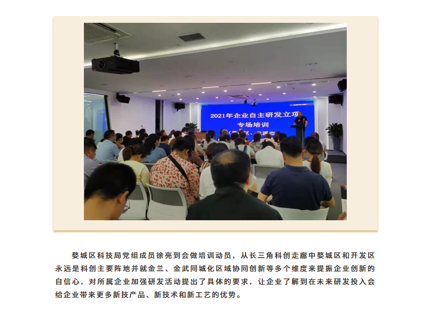 為進一步加強企業研發項目登記管理,幫助企業掌握自主研發立項的思路、方法和系統操作,引導創新主體加大R&D研發投入,解讀企業研發經費加計扣除等科技政策。6月21日,在市科技局的指導下,市人才科創中心聯合婺城區和蘭溪市,組織2021年企業自主研發立項線上線下專場培訓會在浙中科技大市場暨“揭榜掛帥”服務中心順利召開。此次參加線上、線下培訓人員共計160人左右。浙中科技大市場和金華市高新技術企業協會具體承辦。