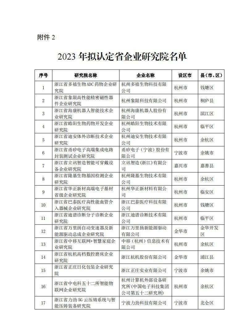 按照工作安排,我廳組織開展了2023年省重點企業研究院、省企業研究院、省高新技術企業研究開發中心認定工作。在各市科技局推薦的基礎上,經評審和復核,報廳務會審議同意,擬認定(備案)“浙江省高效可靠光儲逆變器重點企業研究院”等50家重點企業研究院為省重點企業研究院、“浙江省多禧生物ADC藥物企業研究院”等265家企業研究院為省級企業研究院、“浙江省劍齒虎云服務高新技術企業研究開發中心”等1142家高新技術企業研發中心為省級高新技術企業研究開發中心,現予以公示(詳見附件)。公示時間7天。對公示對象有異議的,請書面向我廳反映。以單位名義提出異議的應加蓋單位公章,以個人名義提出異議的應簽署個人真實姓名和聯系方式。